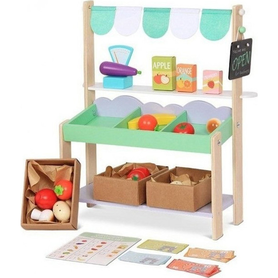 Ανοίξτε το δικό σας μανάβικο και γίνετε ο καλύτερος έμπορος! Βελτιώνει τη δημιουργικότητα, το παιχνίδι ρόλων και το διαδραστικό παιχνίδι. Ενισχύει την κοινωνική συμπεριφορά και την αναγνώριση σχημάτων και χρωμάτων. Ο ξύλινος πάγκος αγοράς περιλαμβάνει 37 αξεσουάρ: 12 φρούτα, 1 μαυροπινακάκι, 1 κιμωλία, 1 ζυγαριά, 3 συσκευασίες χυμών, 3 χαρτιά, 1 λίστα με ψώνια, χρήματα παιχνιδιού (12 τμχ) και 3 κιβώτια. Κατάλληλο για παιδιά 3 ετών και άνω.