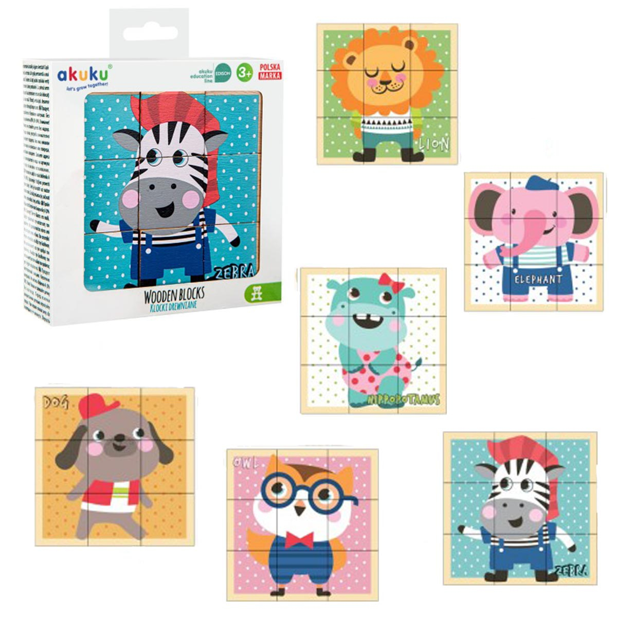Ξύλινο παζλ με 9 κύβους και σχέδιο ζωάκι από την εταιρία Akuku. Είναι κατασκευασμένο από οικολογικό ξύλο, απόλυτα ασφαλές για τα παιδιά. Ο κάθε κύβος έχει 6 πλευρές με 6 διαφορετικές εικόνες για να μπορεί να δημιουργεί το παιδί σας ότι ζωάκι θέλει. Ο δίσκος είναι ιδανικός για να μπορεί το παιδί σας να δημιουργεί και να αποθηκεύει τα παζλ του εκεί. Ιδανικό παζλ για κινήσει το ενδιαφέρον του μικρού σας και να μάθει τα χρώματα, τα σχήματα, τα ζώα, ακονίζοντας την φαντασία του. Κατάλληλο για ηλικίες 3+ ετών.
