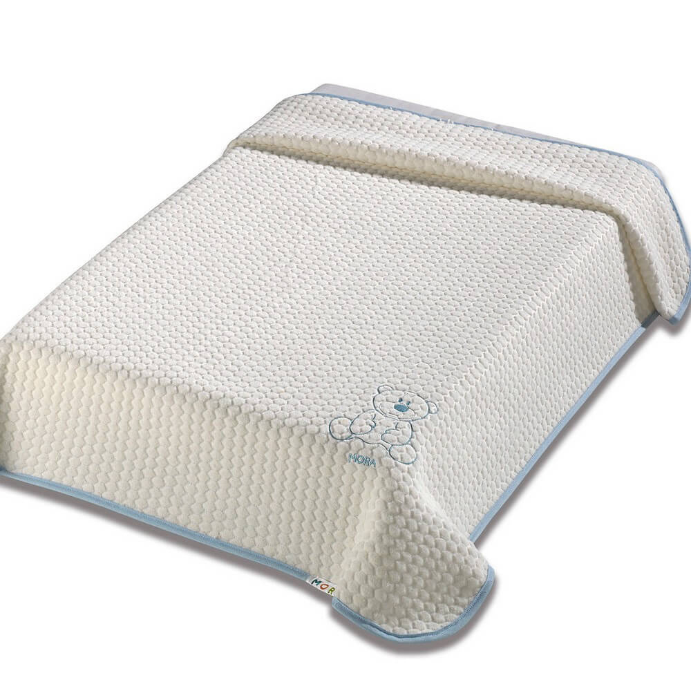 Βρεφική βελουτέ κουβέρτα ισπανικής προέλευσης από την εταιρεία Morven. Είναι κατασκευασμένη από 50% βαμβάκι-50% microfiber βάρους 300gsm με ανάγλυφη επιφάνεια. Έχει εκρού χρώμα με γαλάζιο περιμετρικό ρέλι και σχέδιο αρκουδάκι. Ιδανική για χρήση στο λίκνο του μωρού ή στην αγκαλιά κατά τους χειμωνιάτικους μήνες. Συσκευασία κουτί.