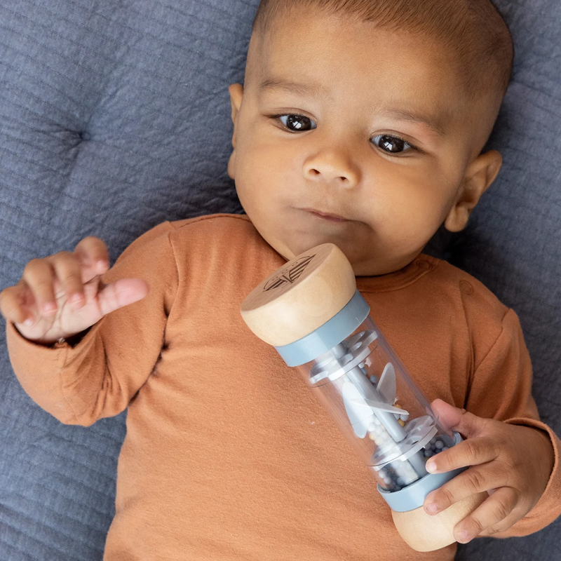 Ξύλινη κουδουνίστρα σε γαλάζιες αποχρώσεις και ήχο βροχής από την εταιρία Little Dutch. Είναι βαμμένη με χρώματα που έχουν ως βάση το νερό, απόλυτα ασφαλές για τα παιδιά. Οι χάντρες σε 3 διαφορετικά χρώματα πέφτουν μέσα από μικρά ανοίγματα κάνοντας την προπέλα να περιστρέφεται, με αποτέλεσμα την δημιουργία ενός ευχάριστου ήχου. Απλώς αναποδογυρίστε την κουδουνίστρα και αφήστε το μωρό σας να απολαύσει τους χαλαρωτικούς ήχους της βροχής. Σχεδιασμένη για μικρά χεράκια και ιδανική για να διεγείρει τις αισθήσεις του μωρού σας. Η ξύλινη κορυφή και το κάτω μέρος είναι εικονογραφημένα με έναν γλάρο και μια βάρκα από τη συλλογή Sailors Bay. Συμμορφωμένο με τα ευρωπαϊκά πρότυπα ασφαλείας EN-71-1-2-3. Κατάλληλο για ηλικίες 3+ μηνών.
