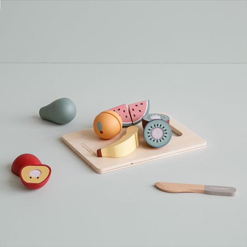 Ξύλινο παιχνίδι ρόλων ξύλο κοπής με φρούτα σε πολύχρωμες αποχρώσεις από την εταιρεία Little Dutch. Κατασκευασμένο από ξύλο σε πολύχρωμες αποχρώσεις. Περιλαμβάνει δίσκο κοπής, μαχαίρι και 6 διαφορετικά φρούτα: μήλο, μπανάνα, ακτινίδιο, αχλάδι, πορτοκάλι και μία φέτα καρπούζι. Όλα τα φρούτα μπορούν χωριστούν στη μέση και να ενωθούν ξανά με Velcro. Κατάλληλο για παιδιά 24+ μηνών.