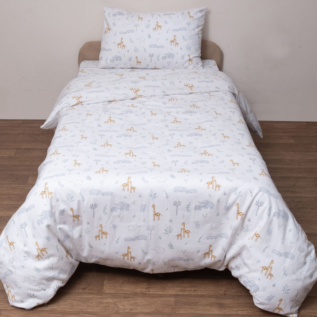 Παπλωματοθήκη κούνιας σε λευκό χρώμα, με γκρι-ώχρα λεπτομέρειες και σχέδιο ζωάκια από την εταιρία Viopros. Το ύφασμα είναι από 100% βαμβακερή φανέλα Ιταλίας που την καθιστά εξαιρετικά μαλακή και ζεστή. Στο σετ περιλαμβάνεται η μαξιλαροθήκη φάκελος με το σχέδιο του πανωσέντονου. **Το σχέδιο στη μαξιλαροθήκη ενδέχεται να διαφέρει από αυτό της φωτογραφίας καθώς η εταιρεία παράγει μαξιλαροθήκες από όλο το σχέδιο του υφάσματος και τις συσκευάζει με τυχαία σειρά** Συνδυάστε τα με τα υπόλοιπα είδη της ίδιας σειράς για ένα ολοκληρωμένο αποτέλεσμα.