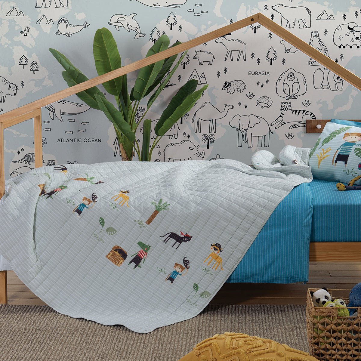 Ημίδιπλο κουβερλί διπλής όψης με γαλάζιο-εκρού χρώμα με παιδικό σχέδιο ζωάκια και πολύχρωμες λεπτομέρειες από την εταιρεία Nef-Nef. Το εξωτερικό ύφασμα είναι από 100% microfiber ενώ η γέμιση από πολυεστερική βάτα βάρους 150gsm. Ιδανική επιλογή για τους ανοιξιάτικους και καλοκαιρινούς μήνες.