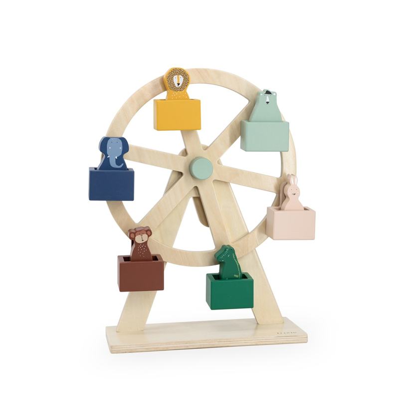 Ξύλινο παιχνίδι ρόδα του λούνα παρκ από την εταιρία Trixie. Κατασκευασμένα από 100% πιστοποιημένο ξύλο MDF και ξύλο οξιάς με την πιστοποίηση FSC©και βαμμένα με χρώματα που έχουν ως βάση το νερό, ασφαλή και μη τοξικό για παιδιά. Το παιδί σας θα διασκεδάσει τοποθετώντας τα ζωάκια στα καθίσματα και χρησιμοποιώντας την λαβή στο πίσω μέρος για να γυρίσει τον τροχό. Κατάλληλο για ηλικίες 18+ μηνών.