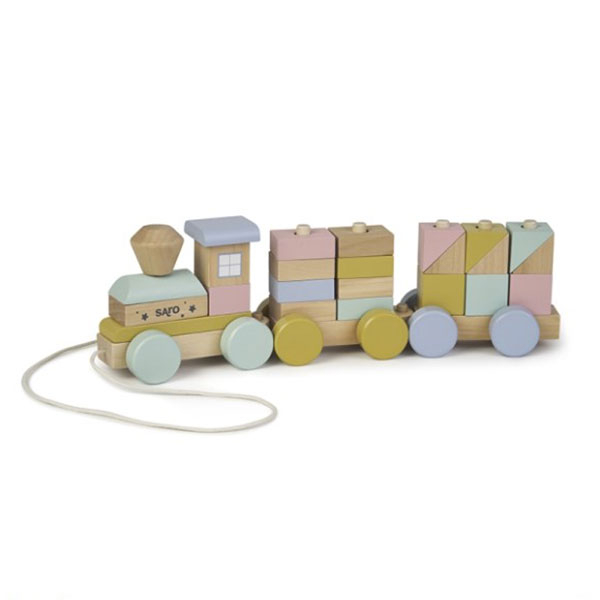 Ξύλινο τρενάκι με τουβλάκια της εταιρείας Saro. Αποτελείται από 3 βαγόνια, 27 κομμάτια σε πολύχρωμα, διαφορετικά σχήματα. Μπορεί να χρησιμοποιηθεί σαν τρενάκι ή σαν παιχνίδι στοίβαξης. Ενθαρρύνει την δημιουργικότητα, αναπτύσσει τις κινητικές δεξιότητες και συμβάλλει στο συντονισμό χεριού-ματιού.